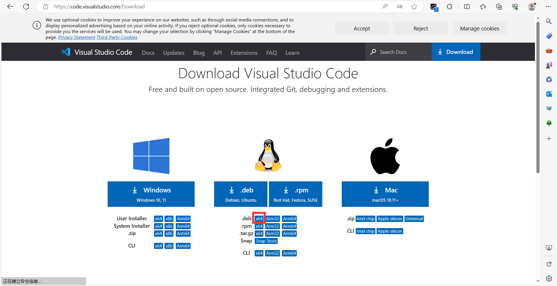 选择中间 Linux 系统下的各种版本进行下载,注意要根据自己的硬件设备选择 X64 、Arm32、Arm64 版本。若硬件是因特尔(X86 架构)则选 x64 的 .deb 文件进行下载,若硬件是树莓派(ARM 架构)则后两者任选即可。