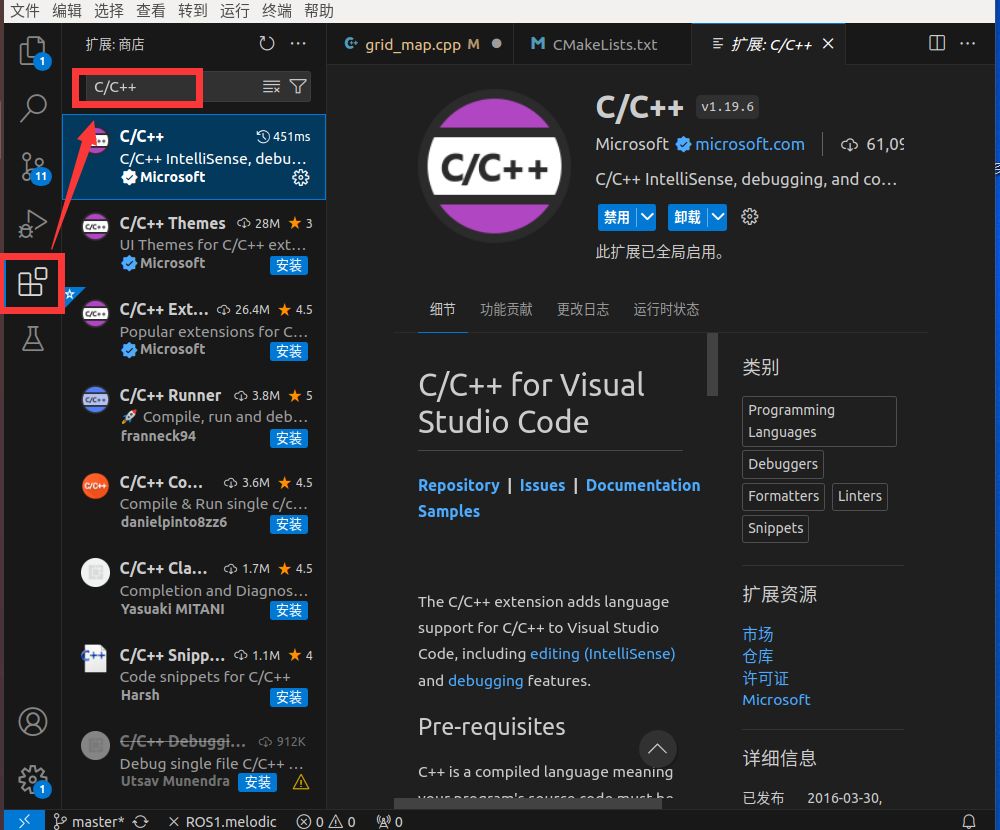 点击在vscode界面最左侧的Extensions图标(打开快捷键:ctrl+shift+X),搜索“C/C++”,点击进行安装。