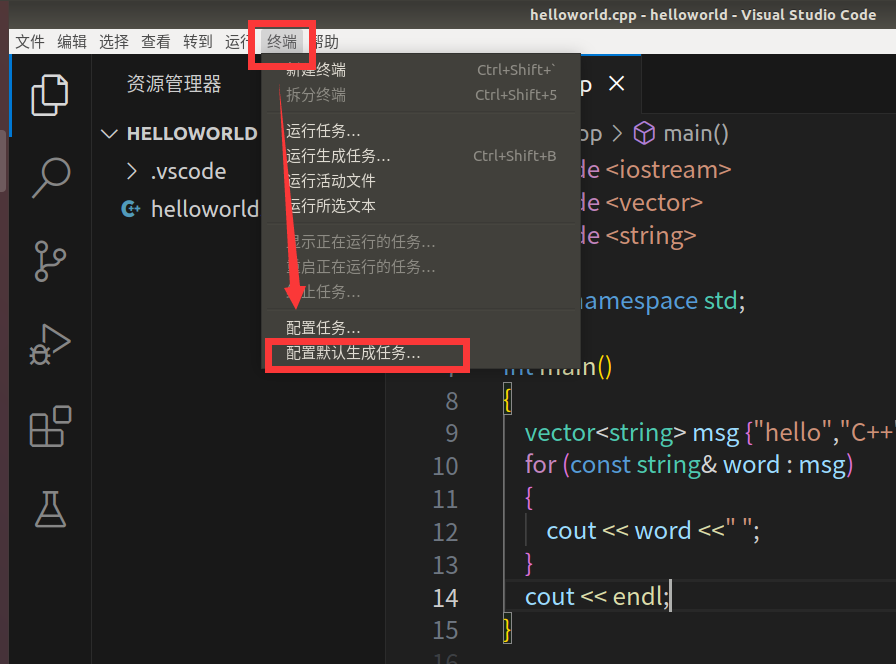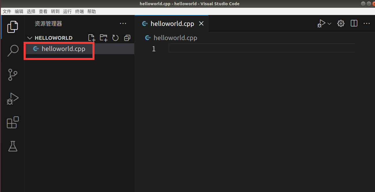 在helloworld.cpp粘贴如下代码并保存(Ctrl+S),在vscode左侧栏的Explorer视图中可以看到新建的文件helloworld.cpp。