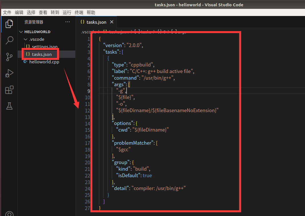 上述操作将自动在.vscode文件夹下生成tasks.json文件。当然也可以在Explorer视图中新建文件,将下面代码复制进去,手动生成tasks.json,教程后面的配置文件也均可这样生成。其中代码类似如下: