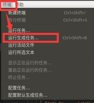 (2)执行tasks.json中定义的编译任务。快捷键ctrl+shift+B或者从菜单中选择运行:终端>运行生成任务。