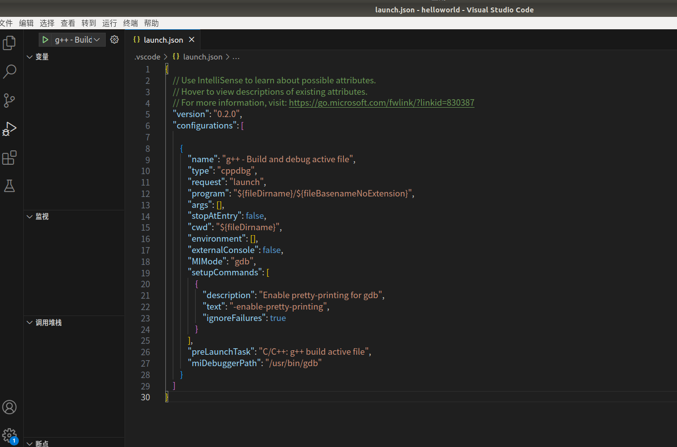 stopAtEntry: 默认情况下,C++拓展不会向源代码添加任何断点,stopAtEntry 值设置为 false。