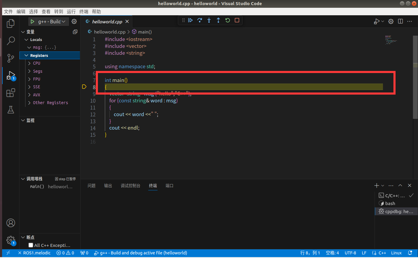 (2)配置vscode后,将通过在VSCode中编译和调试一个简单的C++程序。