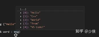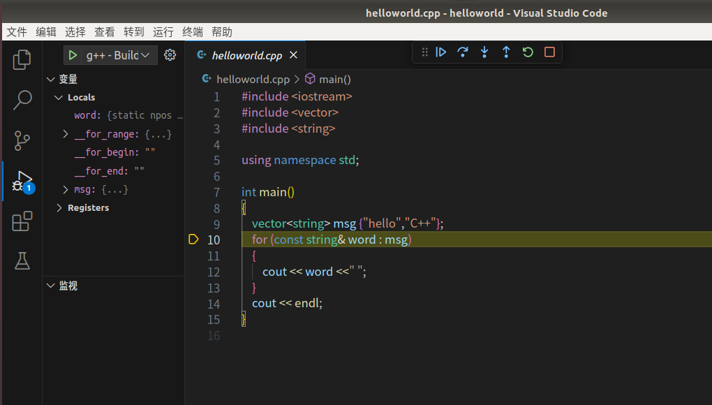 (1)单击调试控制面板中的 Step over 图标或者按F10。将程序执行推进到 for 循环的第一行,并跳过创建和初始化 msg 变量时调用的 vector 和 string 类中的所有内部函数调用。留意侧面“变量”窗口中的变化: