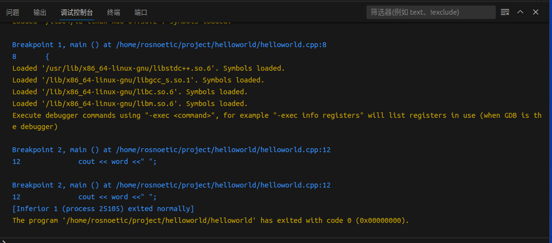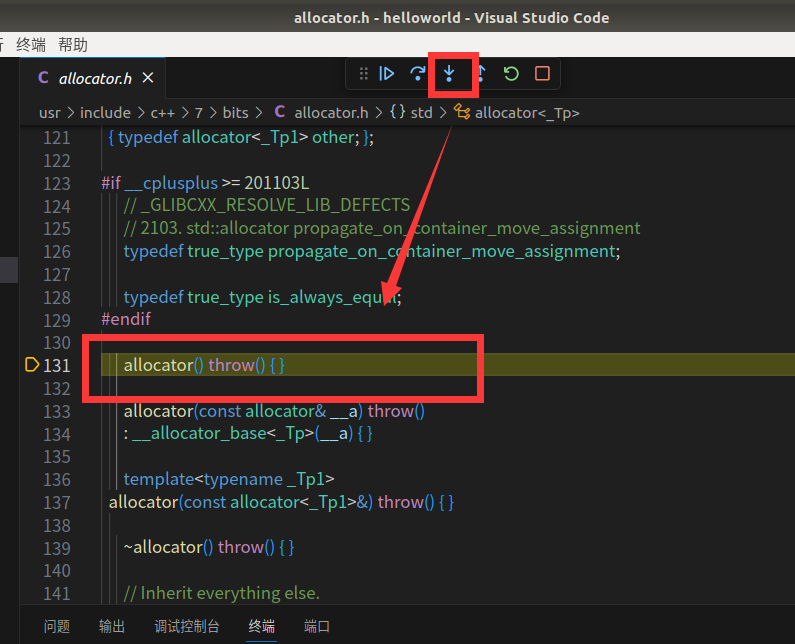 然后按 F5 从标准库头文件中的当前行开始执行。执行将在 cout 中断。 循环完成后,可在集成终端的调试控制台选项中看到输出,以及 GDB 输出的一些其他诊断信息。