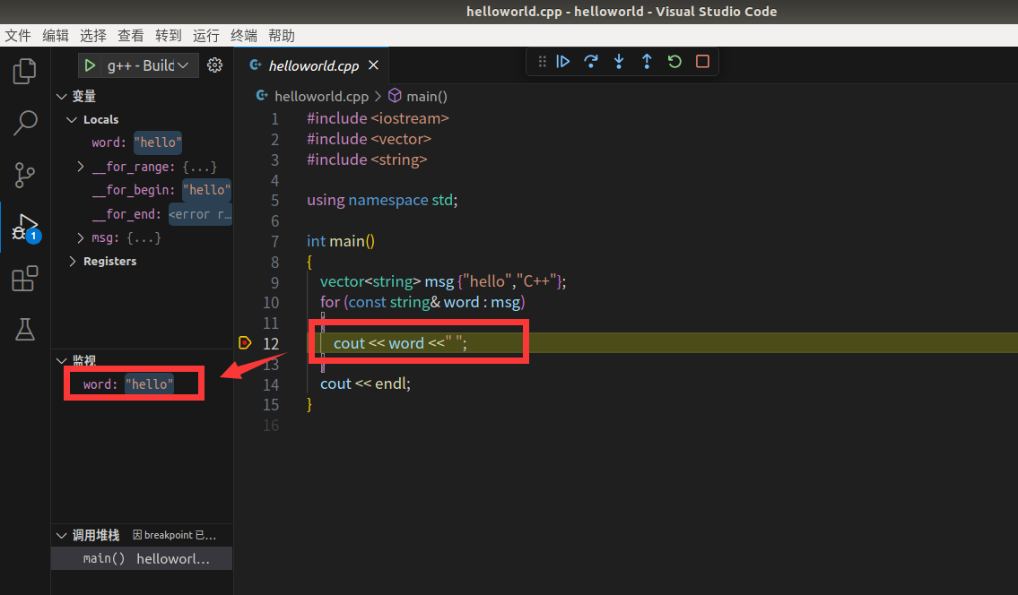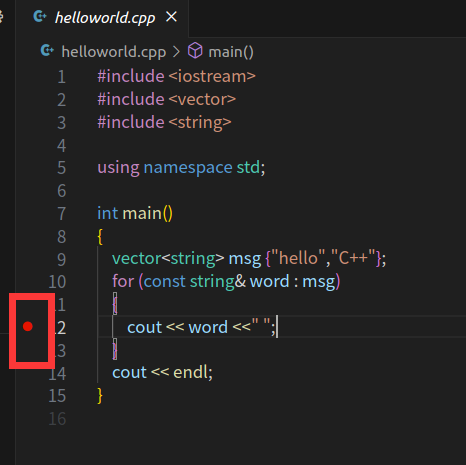 可以一直按Step over以返回到自己的代码。另一种方法是在代码中设置断点,方法是切换到代码编辑器中的 helloworld.cpp,比如在循环内cout语句处设置断点,将鼠标放置于该行上,按 F9,最左边将出现一个红点,表示该行已设置断点。(也可用鼠标点击代码行的最左侧来设置断点,再次单击或者按F9将取消断点)