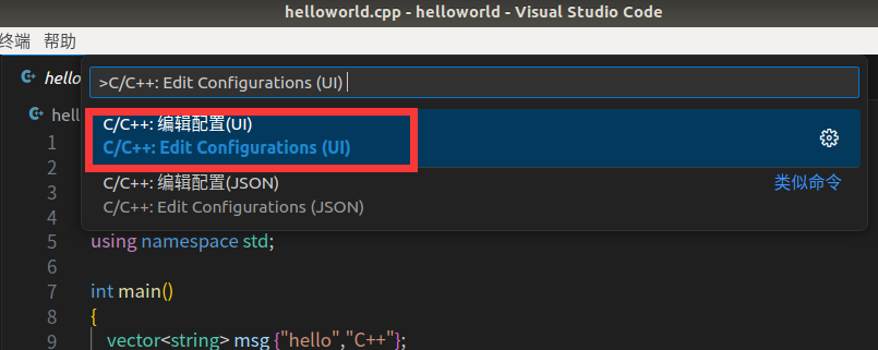 如果你想更多地控制 C/C++ 扩展,你可以创建一个 c_cpp_properties.json 文件,它允许你更改设置,例如编译器的路径、包含路径、C++ 标准(默认为 C++17),等等。 您可以通过从命令面板 (Ctrl+Shift+P) 运行命令 C/C++: Edit Configurations (UI) 来查看 C/C++ 配置 UI。(这时.vscode下会自动生成c_cpp_properties.json 文件)