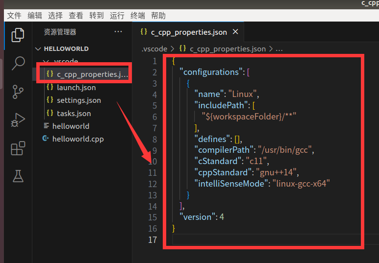如果您的程序包含不在您的工作区或标准库路径中的头文件,您只需要修改包含路径Include path 设置。Visual Studio Code 将这些设置放在.vscode/c_cpp_properties.json 中。如果您直接打开该文件,它应该如下所示: