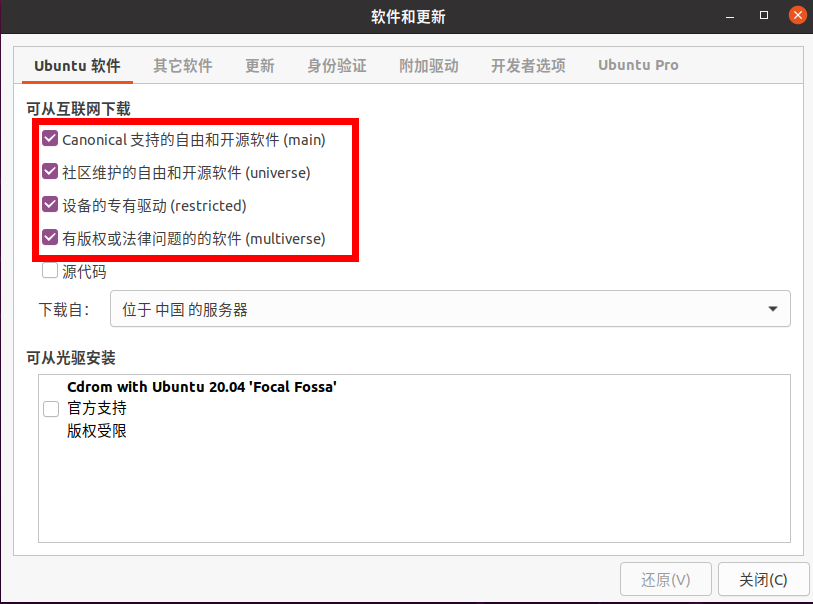 打开后按照下图进行配置(确保勾选了"restricted", "universe," 和 "multiverse.")