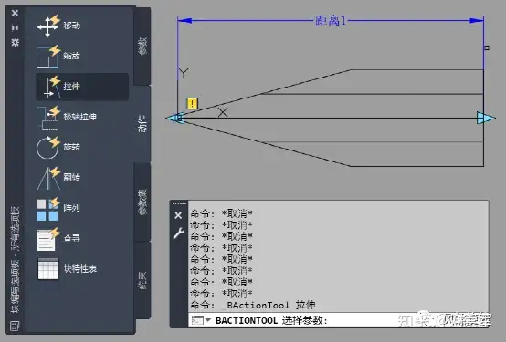 点击图块,可以发现多了一个表示拉伸操作的三角形按钮,鼠标拖拽这个三角形,可以实现图块的拉伸。如果动作添加错误,可以在块编辑界面,右键点击下图中的按钮,通过菜单进行修改或删除。