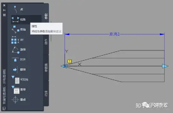 在这里我们想要实现一个PBN离场保护区直线段的拉伸效果,动态改变长度。为此,在离场保护区图块中添加一个“线性”参数。这个参数的一头指向DER位置点,另一头指向转弯点。