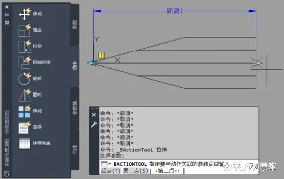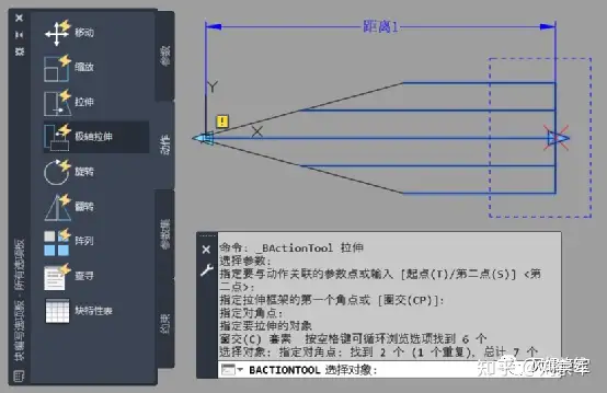 2)根据提示,第二步是指定要进行拉伸的点。我们在距离1的右侧点上点击一下。