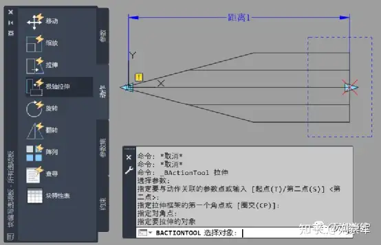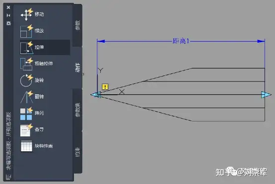 参数菜单中的“线性”,对应着动作菜单中的“拉伸”。这里的步骤比较精细,刚上手时,关联失败主要的原因就是操作太快,没有关注系统的提示。1)在点击“拉伸”菜单之后,根据提示,选择“参数”。我们这里只存在一个参数,就是图中的“距离1”。鼠标左键点击一下“距离1”即可。