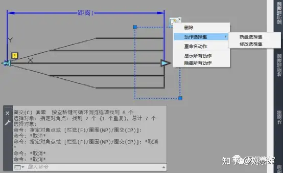 以上就是动态块制作的基本流程。当然,仅有拉伸是远远不够的,在拉伸的基础上,再叠加旋转参数,才会让动态块的使用更灵活。旋转参数的添加步骤,与上面提到的步骤完全一致,只是在第4步,添加图块时,可以将“距离1”参数,当做是图块的一部分,进行选中,之后就可以整体旋转并且可以随意拉伸。具体步骤不再赘述,最终效果如下: