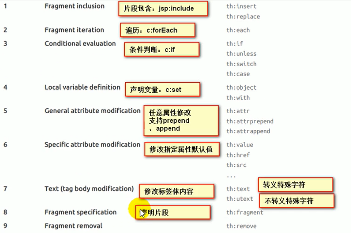 Simple expressions:(表达式语法) Variable Expressions: ${...} 获取变量值 OGNL 1)获取对象的属性、调用方法 2)使用内置的基本对象 #ctx : the context object. #vars: the context variables. #locale : the context locale. #request : (only in Web Contexts) the HttpServletRequest object. #response : (only in Web Contexts) the HttpServletResponse object. #session : (only in Web Contexts) the HttpSession object. #servletContext : (only in Web Contexts) the ServletContext object. ${session.foo} 3)内置的一些工具对象 #execInfo : information about the template being processed. #messages : methods for obtaining externalized messages inside variables expressions, in the same way as they would be obtained using #{…} syntax. #uris : methods for escaping parts of URLs/URIs Page 20 of 106 #conversions : methods for executing the configured conversion service (if any). #dates : methods for java.util.Date objects: formatting, component extraction, etc. #calendars : analogous to #dates , but for java.util.Calendar objects. #numbers : methods for formatting numeric objects. #strings : methods for String objects: contains, startsWith, prepending/appending, etc. #objects : methods for objects in general. #bools : methods for boolean evaluation. #arrays : methods for arrays. #lists : methods for lists. #sets : methods for sets. #maps : methods for maps. #aggregates : methods for creating aggregates on arrays or collections. #ids : methods for dealing with id attributes that might be repeated (for example, as a result of an iteration). Selection Variable Expressions: *{...} 选择表达式:和${}在功能上是一样 补充:配合 th:object="${session.user}" <div th:object="${session.user}"> <p>Name: <span th:text="*{firstName}">Sebastian</span>.</p> <p>Surname: <span th:text="*{lastName}">Pepper</span>.</p> <p>Nationality: <span th:text="*{nationality}">Saturn</span>.</p> </div> Message Expressions: #{...} 获取国际化内容 Link URL Expressions: @{...} 定义URL @{/order/process(execId=${execId},execType='FAST')} Fragment Expressions: ~{...} 片段引用表达式 <div th:insert="~{commons :: main}">...</div> Literals(字面量) Text literals: 'one text' , 'Another one!' ,… Number literals: 0 , 34 , 3.0 , 12.3 ,… Boolean literals: true , false Null literal: null Literal tokens: one , sometext , main ,… Text operations:(文本操作) String concatenation: + Literal substitutions: |The name is ${name}| Arithmetic operations:(数学运算) Binary operators: + , - , * , / , % Minus sign (unary operator): - Boolean operations:(布尔运算) Binary operators: and , or Boolean negation (unary operator): ! , not Comparisons and equality:(比较运算) Comparators: > , < , >= , <= ( gt , lt , ge , le ) Equality operators: == , != ( eq , ne ) Conditional operators:(条件运算-三元运算符) If-then: (if) ? (then) If-then-else: (if) ? (then) : (else) Default: (value) ?: (defaultvalue) Special tokens:(特殊操作) No-Operation: _