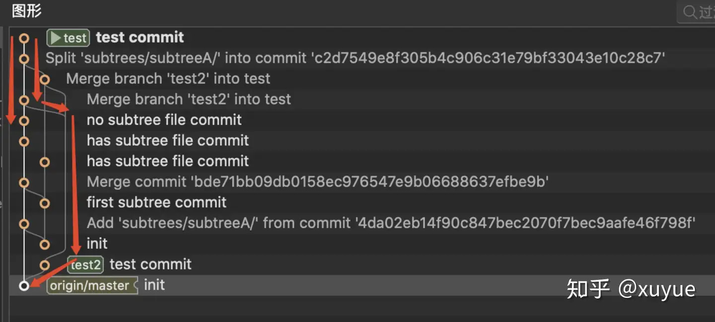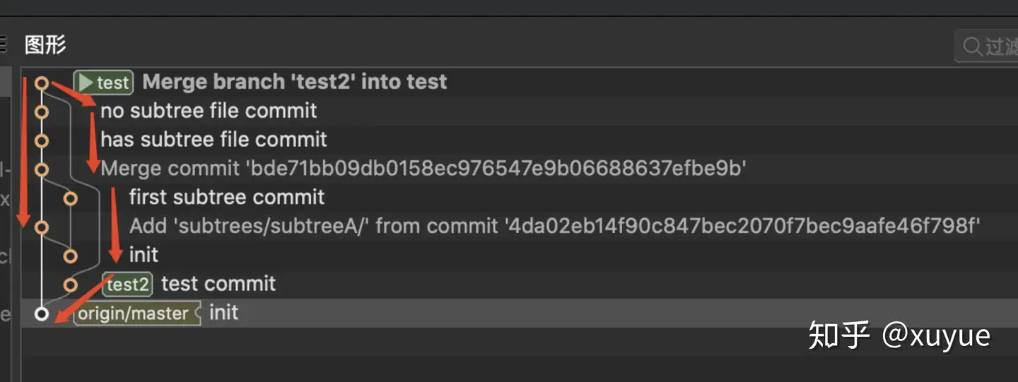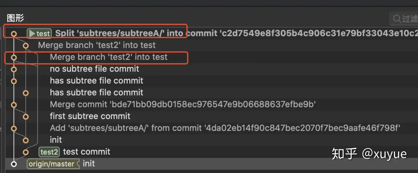 这个情况在项目刚引入subtree时很容易发生。原因是有类似这样的提交树,test1在某个提交执行了subtree add,test2在subtree add之前就checkout出来了,最后再合入test。