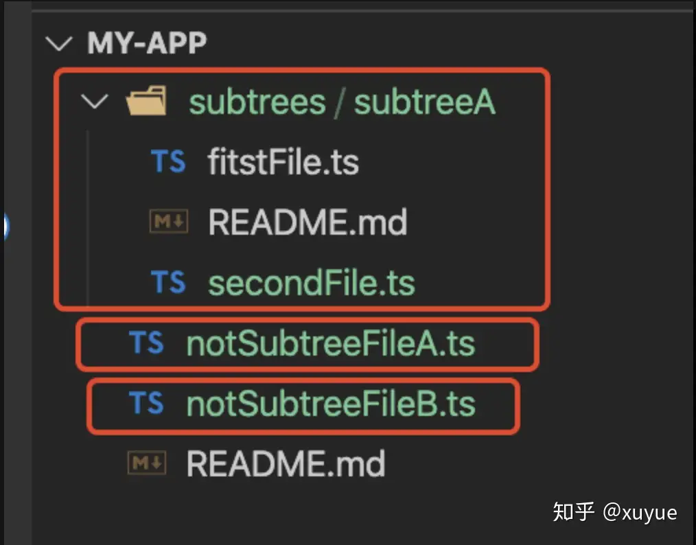 - 实际操作: 首先在my-app添加三个文件 /subtrees/subtreeA/secondFile.ts /notSubtreeFileA.ts /notSubtreeFileB.ts 把/subtrees/subtreeA/secondFile和/notSubtreeFileA作为一次提交 has subtree file commit 把/notSubtreeFileB作为一次提交 no subtree file commit