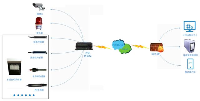 传输层:传输层主要由计讯数采仪构成,可以通过计讯数采仪将现场采集图像、视频、污水各项数据通过5G/4G/3G无线网络传输到应用层,同时接收应用层对数据采集时间、设备调试、故障修复等情况下发的数据,及时改变参数;