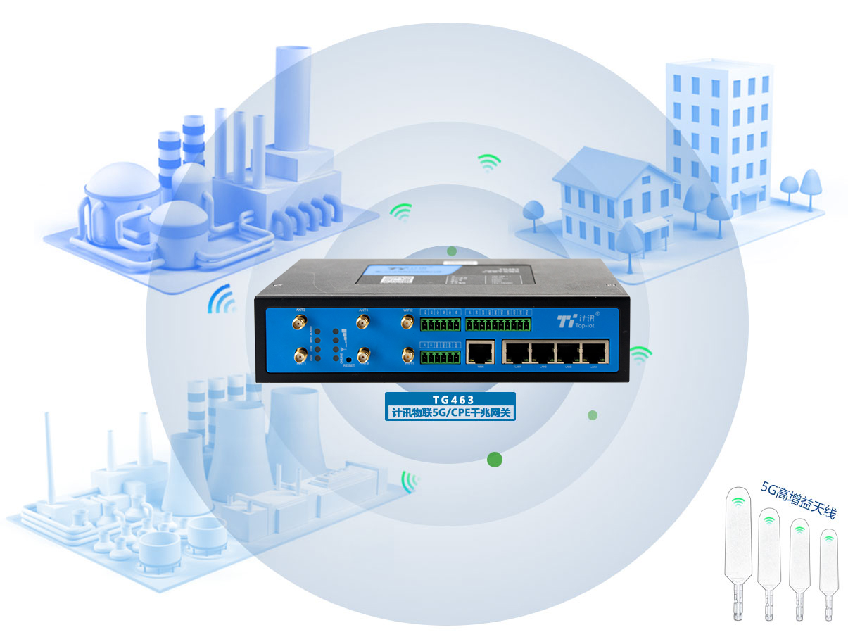 计讯物联5G工业级CPE路由器TG463,无线终端接入设备,支持移动电信联通物联网卡蜂窝网络转化Wi-Fi信号或有线接入。2.4G Wifi功能5.8G Wifi(可选),支持4×LAN、1×WLAN、1×RS232(1×RS485)、1×RS485、SIM卡、TF卡、2×DI、3×继电器、3×ADC、4×POE供电。工业级设计,WDT双看门狗设计,防掉线机制,32位高端通信处理器,运行稳定安全可靠,工业CPE TG463广泛应用于智能电网、智能交通、智能家居、金融、供应链自动化、工业自动化、智能建筑、消防、公共安全、环境、气象、智慧医疗、遥感勘测、军事、空间探索、农业、林业、水务、煤矿、石化等领域。