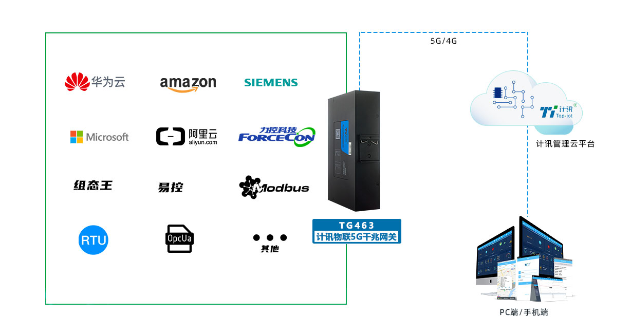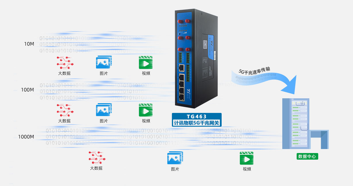 计讯物联5G物联网网关TG463具备摄像机高清视频采集传输能力,支持电信、移动、联通5G/4G蜂窝网络、WIFI、以太网上传监控中心,高速率低延时,强大协议转换能力实现监测点与监控中心的无缝对接,以及各监测点的横向数据互动。数据多中心同步,相关人员可通过监控大屏、pc端、移动端、app等多途径远程监控、调度、控制、历史数据查询,建立安全高时效的视频监控系统。