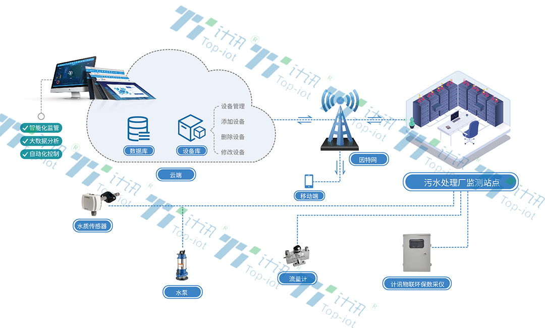 计讯物联分散式污水站监测站利用物联网技术,实现对分散式污水站进行实时监测,现场的污染物浓度和治理设施运行状态的配套监测。可实时采集企业总用电、工艺生产设备用电、污染治理设施设备用电等数据,通过设施运行、用电分析等,及时发现环保治理设施、设备等未开启、空转、简书、降频以及异常关闭等未正常工作的情况;同时通过数据分析,还可以实时监控限产和停产整治企业运行状态。通过对产污设施、治污设施等设备用电情况进行实时监控,实现对工业企业生产运行全方位、全条后、全流程管控。实施过程监测做到设施停运告警,待清洁告警,异常告警等功能。