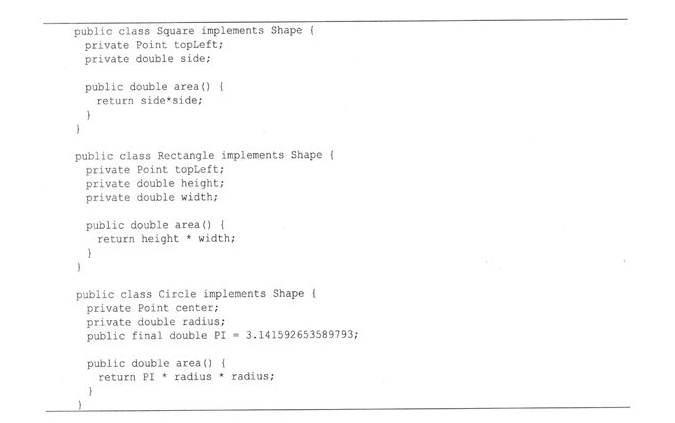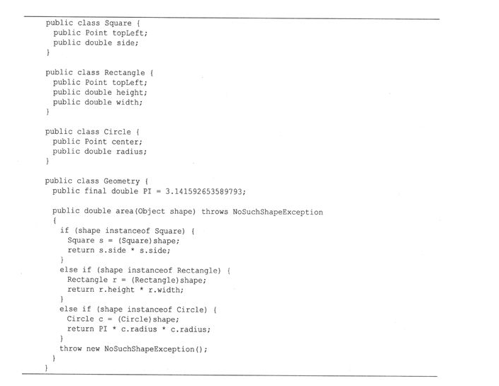 (2)面向对象式代码。面向对象式代码中,area()方法是多态的,不需要有Ceometry类。所以,如果添加一个新形状,现有的函数一个也不会受到影响,但当添加新函数时所有的形状都得做修改。
