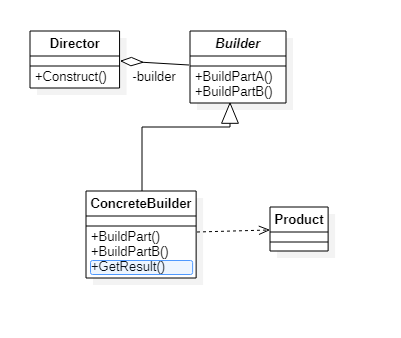 在上图中,定义了一个抽象Builder类并且定义了两个个抽象方法BuildPart(),具体Builder类继承这个抽象builder类并提供BuildPart()方法的实现,这里在不同情形下可能会有多个BuildPart方法,他们代表着这个要构建这个对象需要做的具体工作,但是如果组织执行这些具体工作,以什么顺序执行这些具体工作,则是由Director类决定,Director类在Construct方法中实现了对builder类的实例多个BuildPart工作的组织和顺序调用,通过这个方法就能够使用Builder对象创建出一个正确的Product。