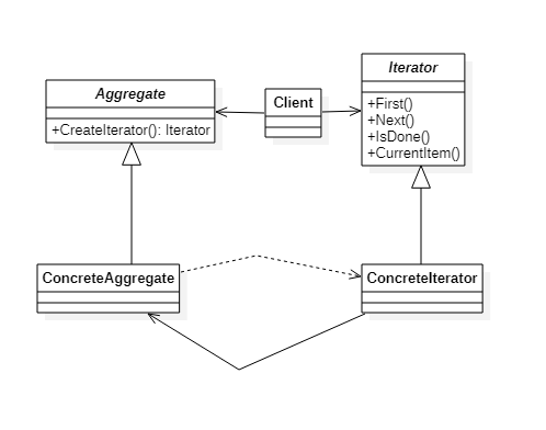 Aggregate类是聚集抽象类,并且提供了创建可以遍历这个聚集类中所持有对象的迭代器(Iterator)。Iterator迭代器抽象类定义了遍历这个聚集类中集合对象的接口,ConcreteIterator具体迭代器可以通过不同的实现提供不同的遍历这个集合对象的方式。ConcreteAggregate具体聚集类可以继承抽象聚集类,提供不同的实现以提供不同的具体迭代器,或使用不同的集合结构。