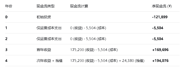 总初始投资 (CF₀): -¥121,899 (负号代表现金流出)
