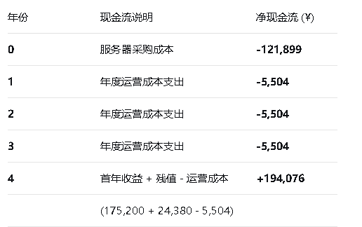 第4年收益 (Year 4 Benefits): ¥175,200 (节省的云服务成本) + 残值 ¥24,380