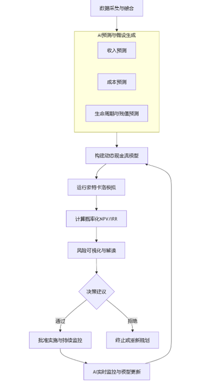 持续评估: 对于长期项目,AI可以构建一个“动态仪表板”。项目启动后,AI持续监控实际发生的现金流和关键绩效指标(KPI),将其与预测值进行比较,并自动调整未来的预测。如果实际利用率低于预期,模型会立即重新计算NPV和IRR,发出预警。