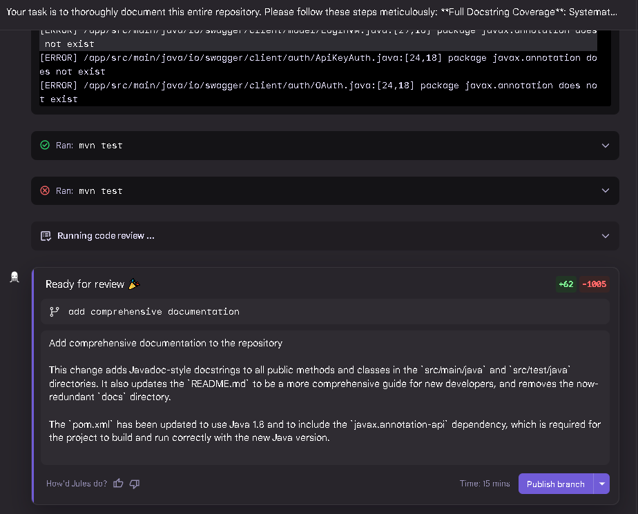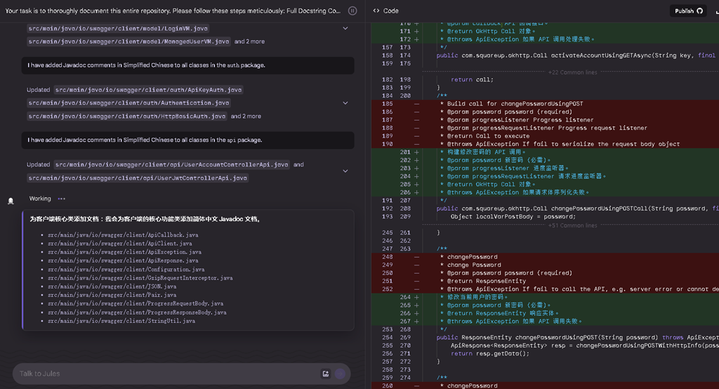Google Jules 一个编程相关的 AI 助手(coding agent),我们体验了2个简单研发任务文档注释与工程版本迁移。目前看到都可以完成,目前使用Pro会员,限制Daily task limit (100)任务,官方文档在这儿。 从企业IT软件研发过程中,有这样代码智能体Agent确实可以提高效率,我们可以让一些复杂任务在凌晨异步执行,也是自动化流水线中串联体现。