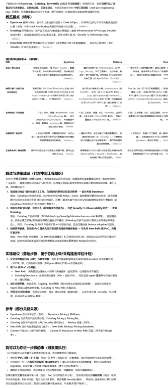 I'm an IT Manager at [insert company]. I’m evaluating AI-powered observability platforms like Dynatrace, Datadog, and New Relic. Research current offerings, pricing, supported environments, and key differentiators in 2025. Include citations and summarize insights in a comparison table with a recommendation for a mid-size engineering org.* Please make sure to use Simplified Chinese as the language for interactions with users, unless it is for specific proprietary terms or situations where English words are more appropriate.