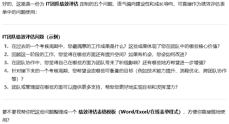 Develop a set of five questions for performance reviews that encourage reflection, future goal setting, and actionable feedback. Tailor to [IT team], and keep the tone constructive and growth-oriented. Present the questions as a list for a review form.* Please make sure to use Simplified Chinese as the language for interactions with users, unless it is for specific proprietary terms or situations where English words are more appropriate.