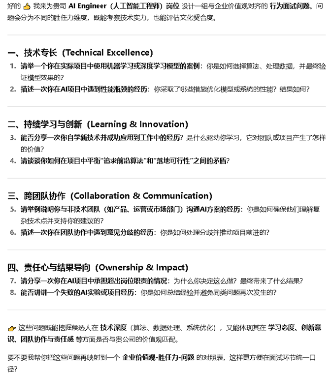 好的,这里是为IT团队的AI工程师岗位设计的、与公司价值观相结合的行为面试问题。这些问题旨在深入评估候选人的技术实力、解决问题的能力以及文化契合度。