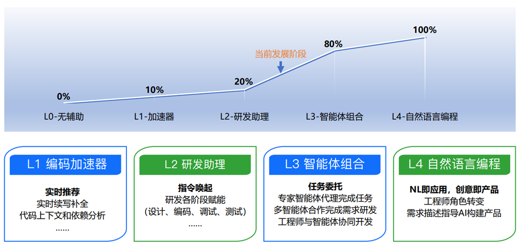 我们必须重新定义AI在研发中的角色。过去,我们将AI视为L1(加速器)或L2(研发助理)级别的工具,它们提供实时推荐和代码补全,本质上是人类主导、AI辅助。
