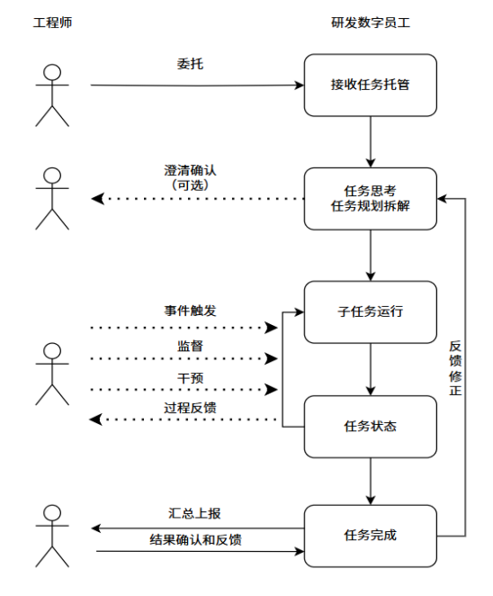 实时委托 (Real-time Delegation): 在日常工作流中,工程师可以随时将当前环节的可拆分任务实时委托给数字员工,例如在代码提交前让它自动修复编译错误。