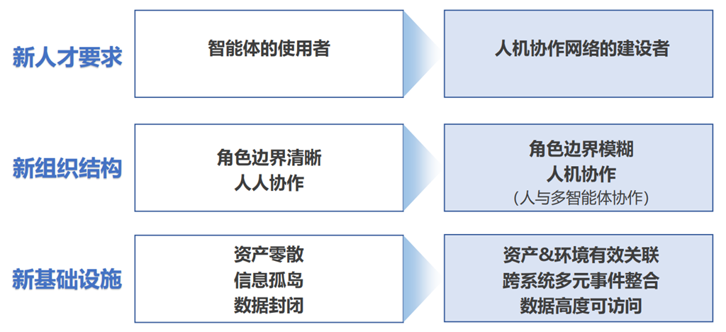 2. 新组织结构 (New Organizational Structure): 从“人人协作”转变为“人机协作(人与多智能体协作)”。组织的角色边界将变得模糊,人类的职责不再是执行所有工作,而是设计和协调高效的人机协作网络。