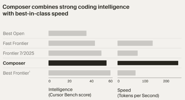 Composer 是我们全新的智能代理模型,面向软件工程的智能与速度而打造。在我们的基准测试中,该模型在编码任务上达到行业前沿水准,生成速度比同类模型快四倍。