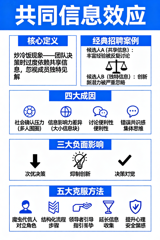 简单来说,就是团队讨论会不自觉地“炒冷饭”,把大家已经知道的事情翻来覆去地讲,而忽略了那些可能对做出最佳决策至关重要、但只有个别人知道的新信息。