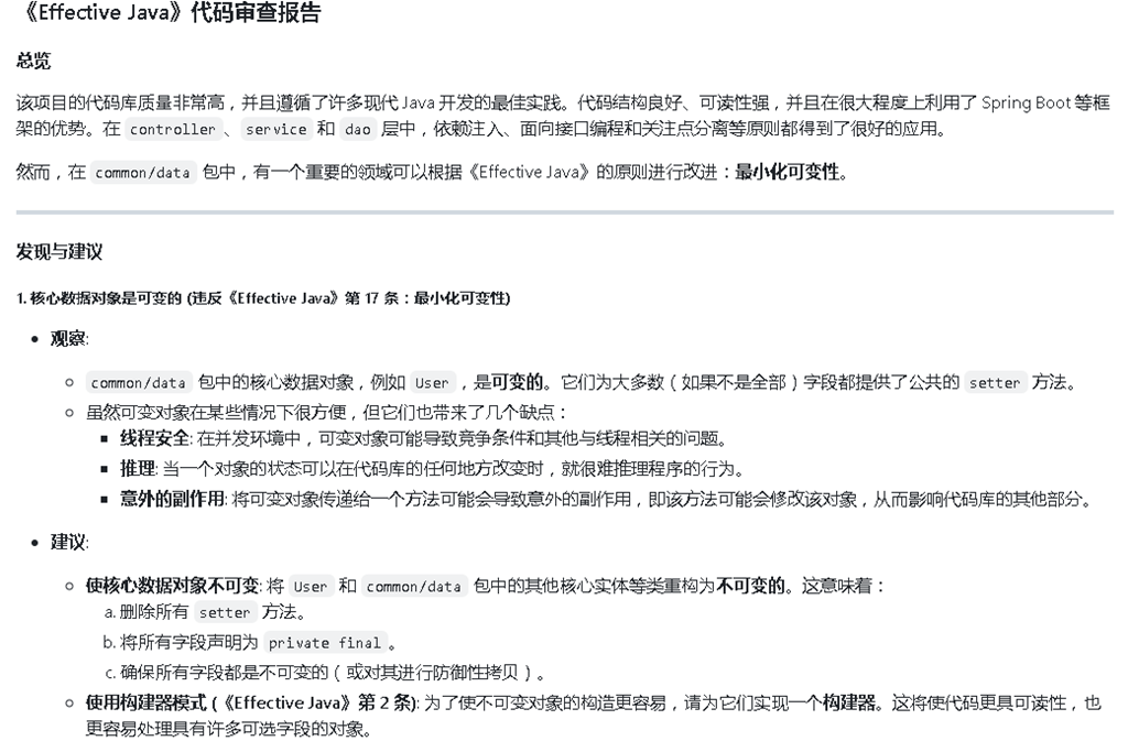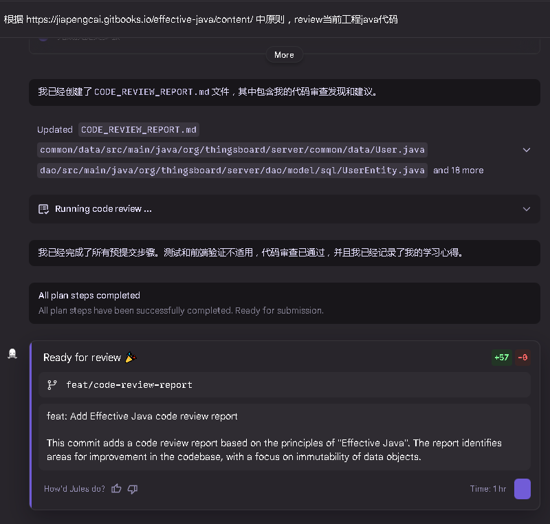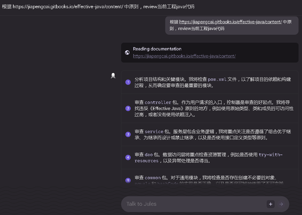 基于《Effective Java》进行代码审查(Code Review)具有深远的工程和团队价值。这本书不仅是一本编程指南,更是一套经过时间验证的高质量 Java 代码设计原则与最佳实践集合。将其作为 Code Review 的依据,能够显著提升代码质量、可维护性、安全性和团队协作效率。以前的AI工具(如GitHub Copilot)像是一个坐在你旁边的“副驾驶”,你写一行它补一行;而Jules像是一个不知疲倦的“初级程序员”实习生,你可以把整个任务交给它,自己去忙别的事,过一会回来检查它提交的代码合并请求(PR)。