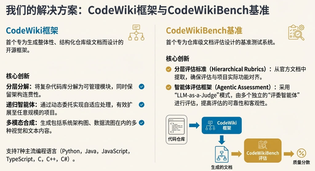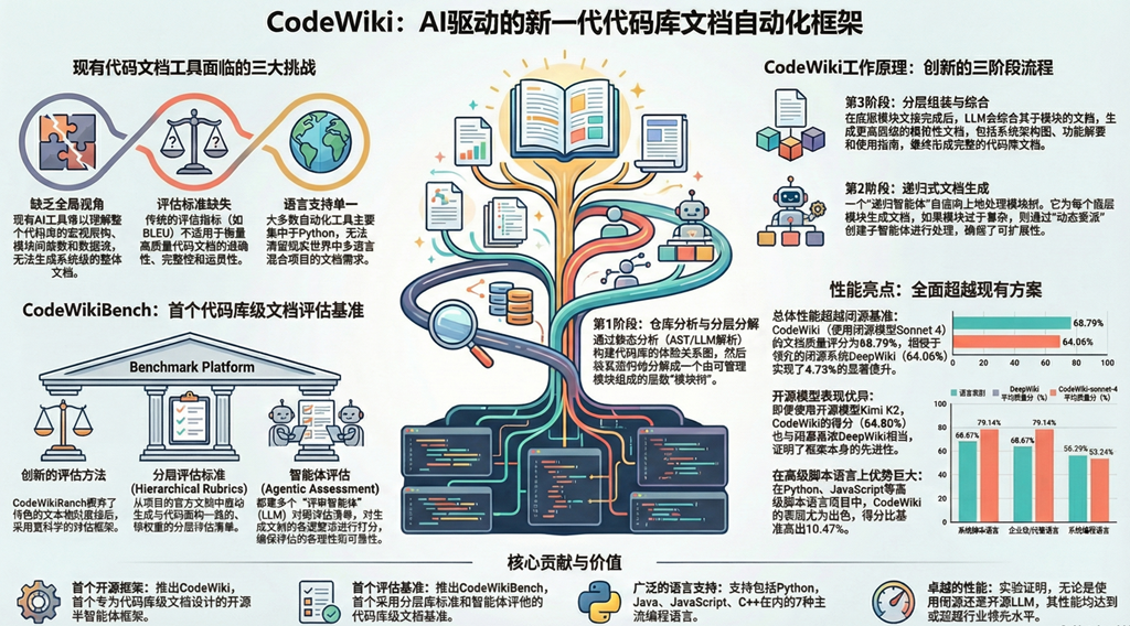 本研究中最显著的潜在偏见来源,莫过于其研究设计中的一个根本性角色重叠:作者团队既是工具 CodeWiki 的开发者,也是评估标准 CodeWikiBench 的创建者。论文明确写道:“我们提出了 CodeWiki……”(We present CodeWiki...),紧接着又说“我们引入了 CodeWikiBench……”(we introduce CodeWikiBench...)。