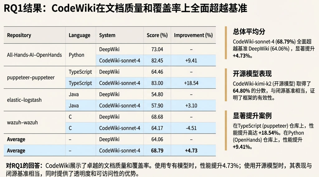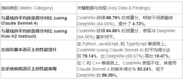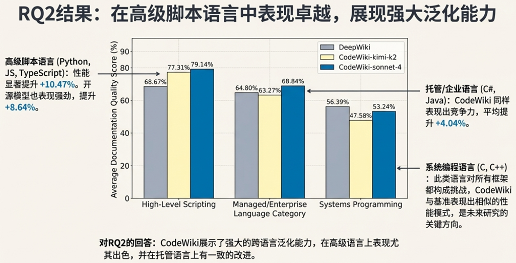 • 最可信的证据: 数据清晰地表明,CodeWiki 在处理以 Python、JavaScript 为代表的高阶脚本语言时,展现出显著的效能优势,其作为开源工具的身份也为其价值增添了重要砝码。同样确定无疑的是,它在面对 C/C++ 等系统级编程语言时,目前仍力有不逮,存在明确的局限性。