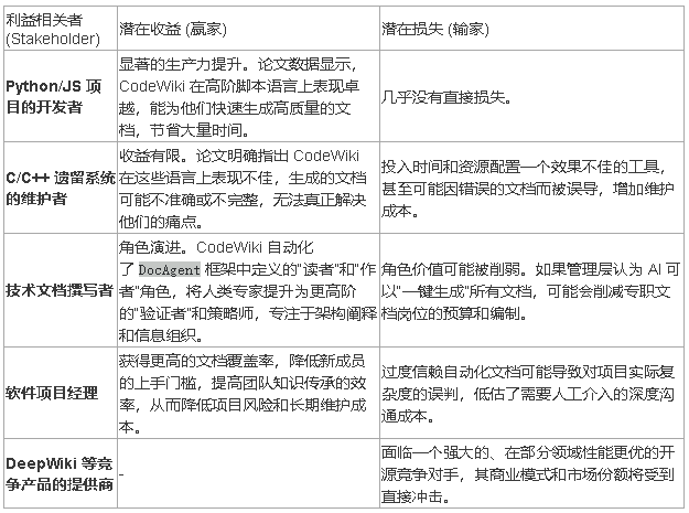 任何技术都非真空中的存在,它的价值和影响是由其所处的生态系统中的不同参与者共同定义的。仅仅听取技术创造者的单一叙事是远远不够的。本章将从不同利益相关者的角度审视 CodeWiki,识别其应用可能产生的赢家和输家,并特别关注那些在论文的宏大叙事中可能被忽视的声音。