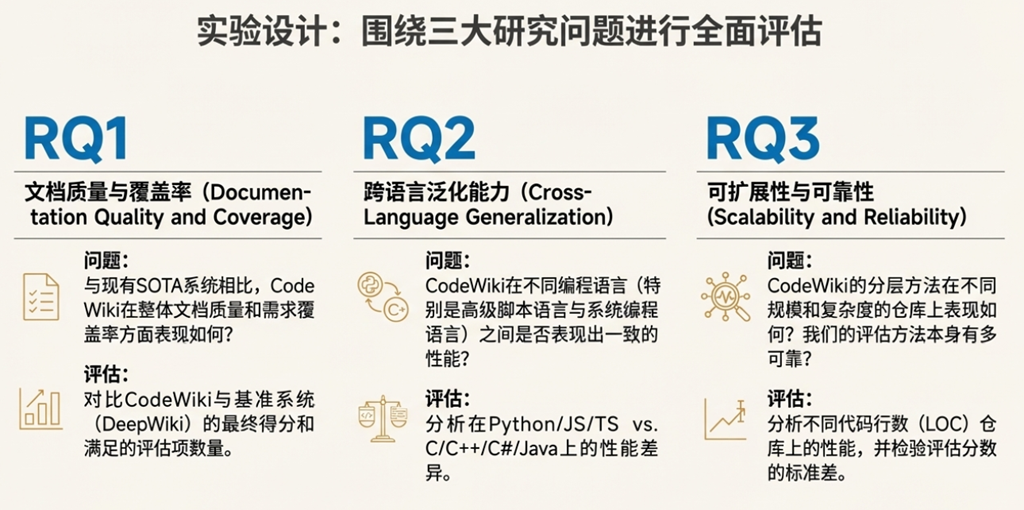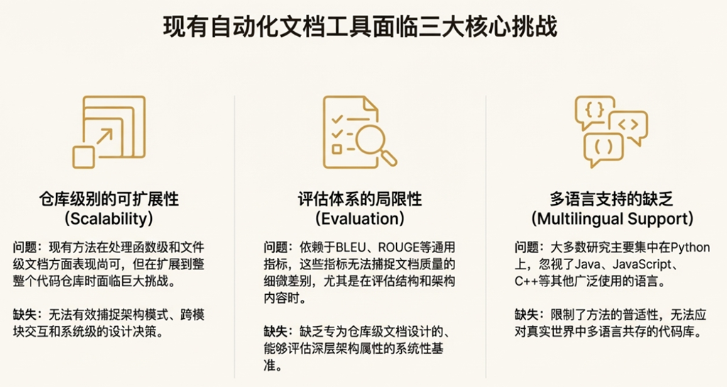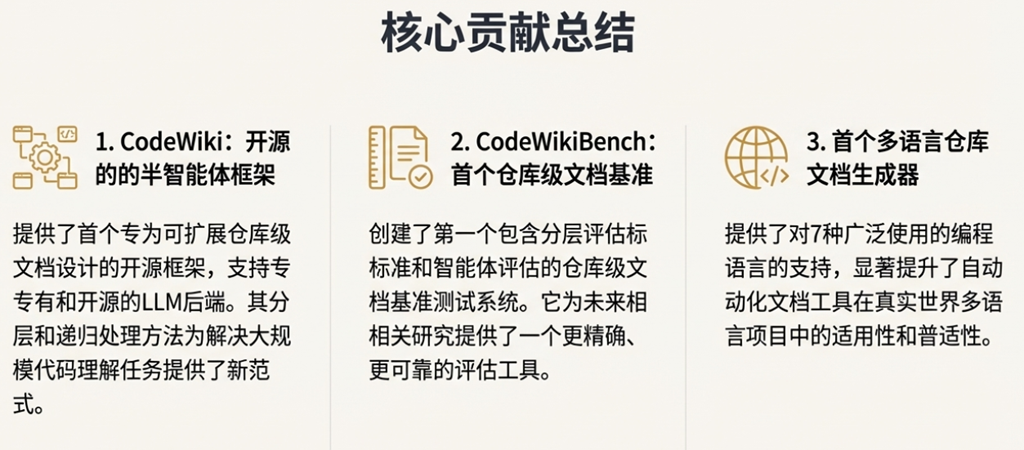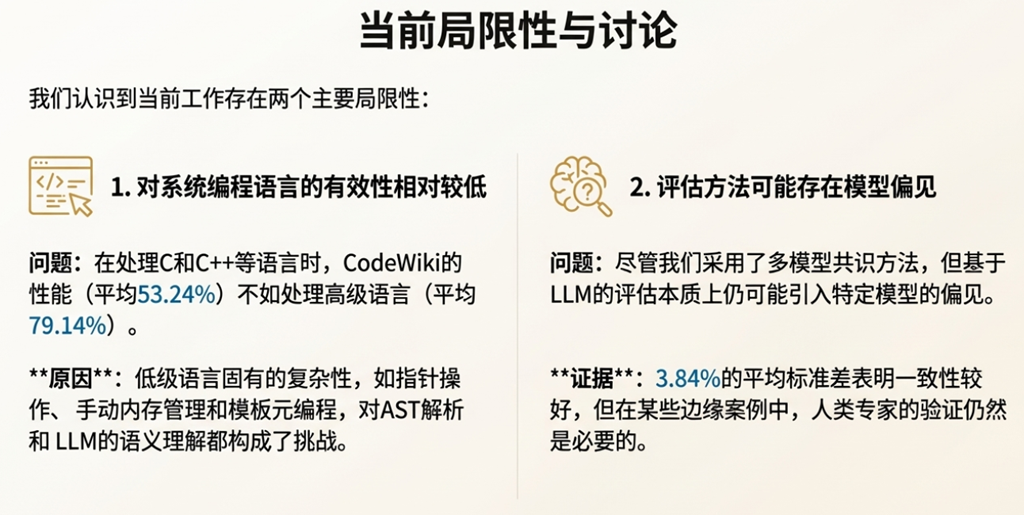 • 创新与局限的矛盾: 论文将创新的评估框架 CodeWikiBench 作为一个核心贡献,该框架依赖 “LLM-as-a-Judge” 模式。但与此同时,作者在局限性部分明确承认,“依赖 LLM 的评估可能会引入模型特有的偏见”。这种“以子之矛,攻子之盾”的内在张力,一方面体现了研究的坦诚,另一方面也提醒我们,其评估体系的客观性本身就建立在一个尚在探索中的、并非无懈可击的方法论之上。