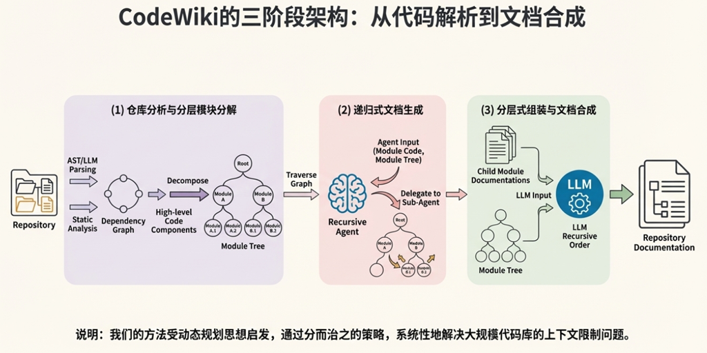 • 问题:小型项目或独立开发者的需求是什么? CodeWiki 的设计思想是处理“大型”、“复杂”的代码库,其多智能体、递归分解的框架显得相当“重型”。对于一个小型项目或独立开发者而言,部署和维护这样一套复杂的系统可能得不偿失(Overkill)。他们可能更需要一个轻量级的、集成在IDE里的简单插件,而非一个庞大的框架。