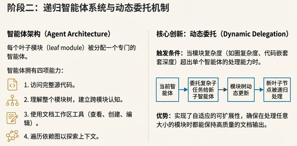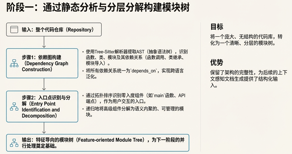 • 假设 1: 层次化分解的优越性。 CodeWiki 的核心方法论是“hierarchical decomposition”(层次化分解)、“recursive agent-based processing”(递归式智能体处理)和“hierarchical assembly”(层次化组装)。这背后隐含的假设是:将大型代码库像树状结构一样层层分解,是理解和记录其复杂性的最优解。 这个假设在面对许多现代软件架构(如微服务、事件驱动架构)时可能面临挑战,因为这些架构的依赖关系更像一张复杂的网,而非一颗简单的树。
