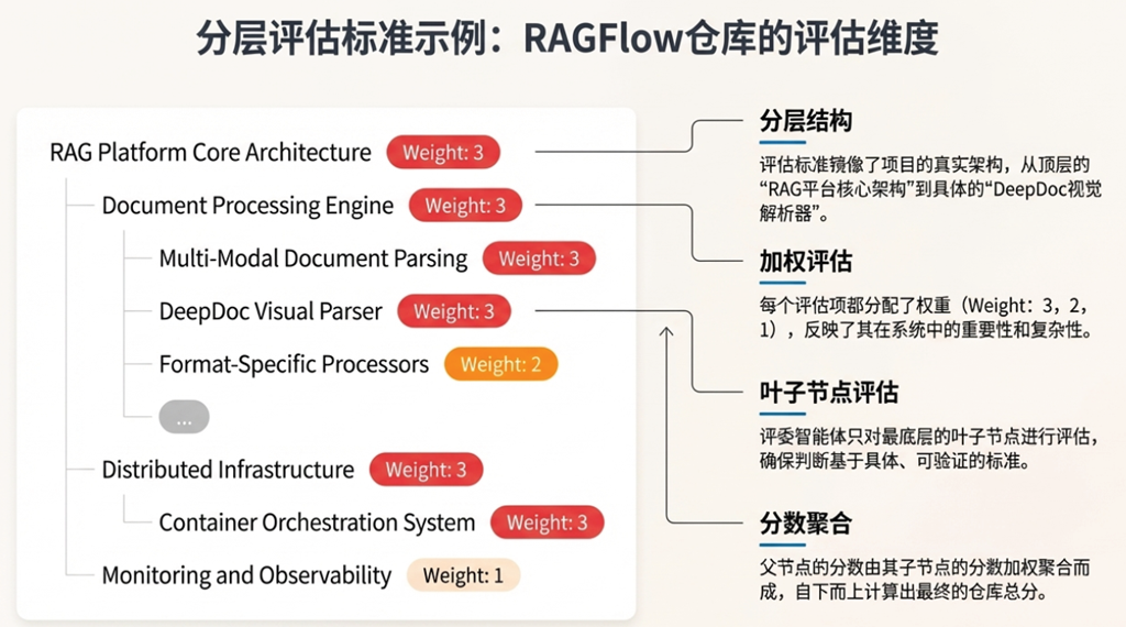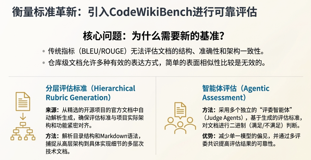 这种“自己出题,自己解答”的模式,极易在无意识中产生系统性的偏见。作者不仅设计了工具,还设计了用于评估的“rubrics”(评估准则)和执行评估的“Judge Agents”(评委智能体),形成了一个封闭的验证循环。评估标准(层次化结构)可能天然地与 CodeWiki 的输出结构(同样是层次化的)高度耦合。这会导致评估过程更像是一场“模式匹配”,而非对文档真实质量的客观衡量。