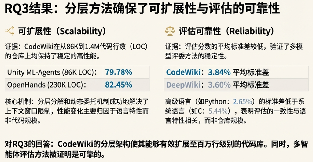 • 最关键的假设: CodeWiki 的整个理论大厦,稳固地建立在两个需要持续审视和验证的核心假设之上:其一,层次化的分解是应对代码库复杂性的最佳路径;其二,大型语言模型具备作为文档质量可靠“法官”的能力。这两个假设的有效性,直接决定了该框架的上限。