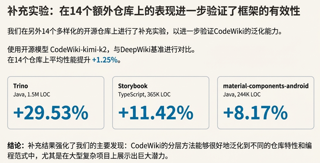 • 性能声明的矛盾: 论文在摘要和结论中宏观地宣称 CodeWiki “表现优于”基线。然而,数据细节则坦诚地指出,它在 C/C++ 等系统编程语言上表现不佳,甚至落后于基线。这揭示了其“整体优越”这一宏大声明背后,隐藏着显著的特定领域短板,其通用性并非如表面宣称的那般完美。